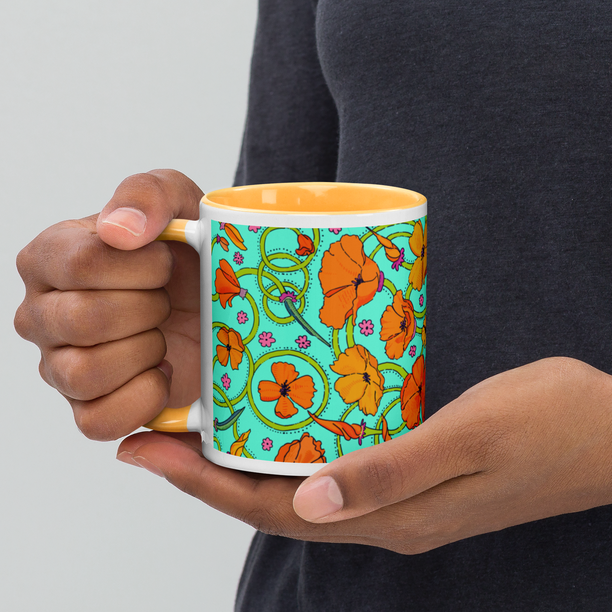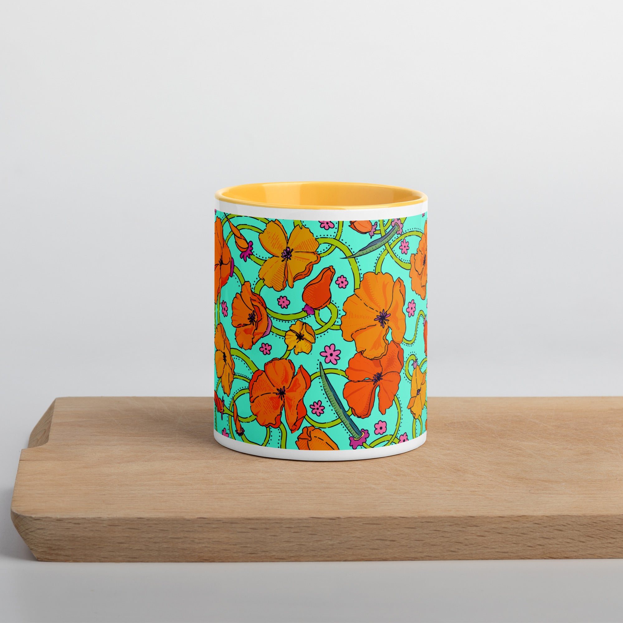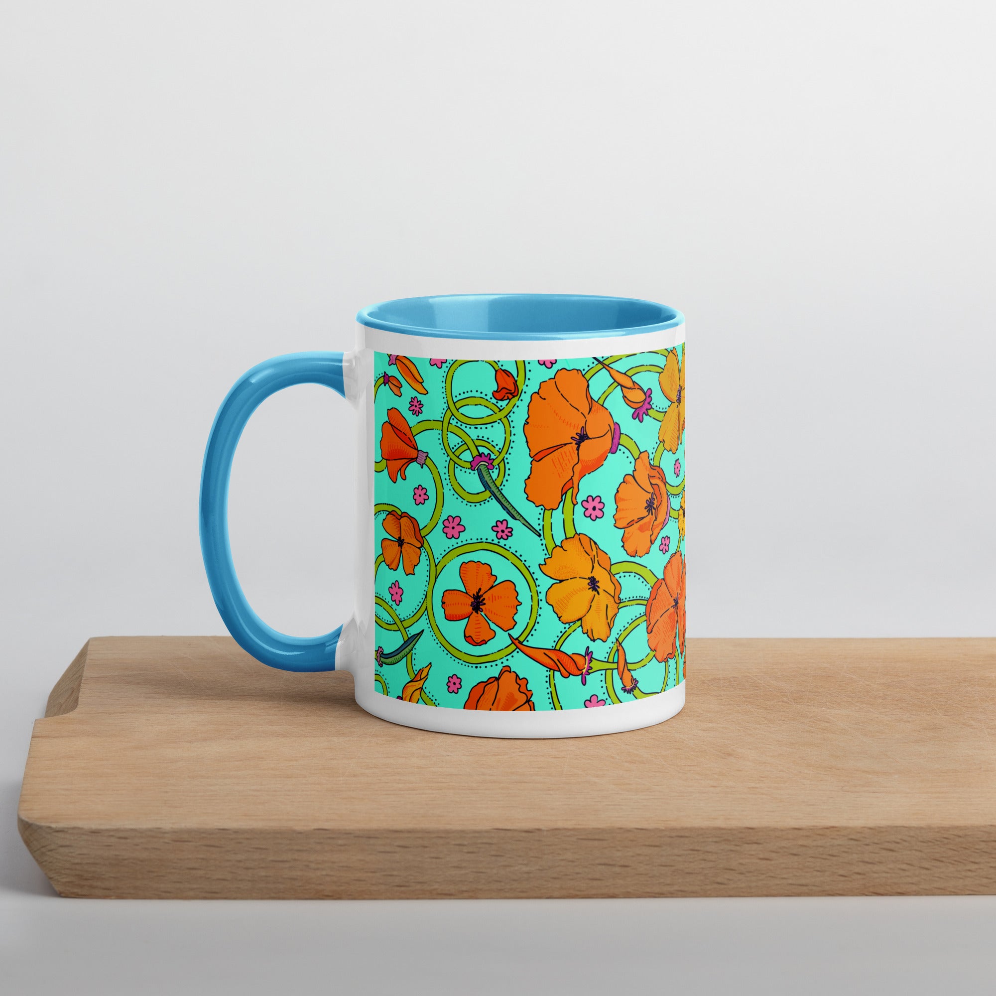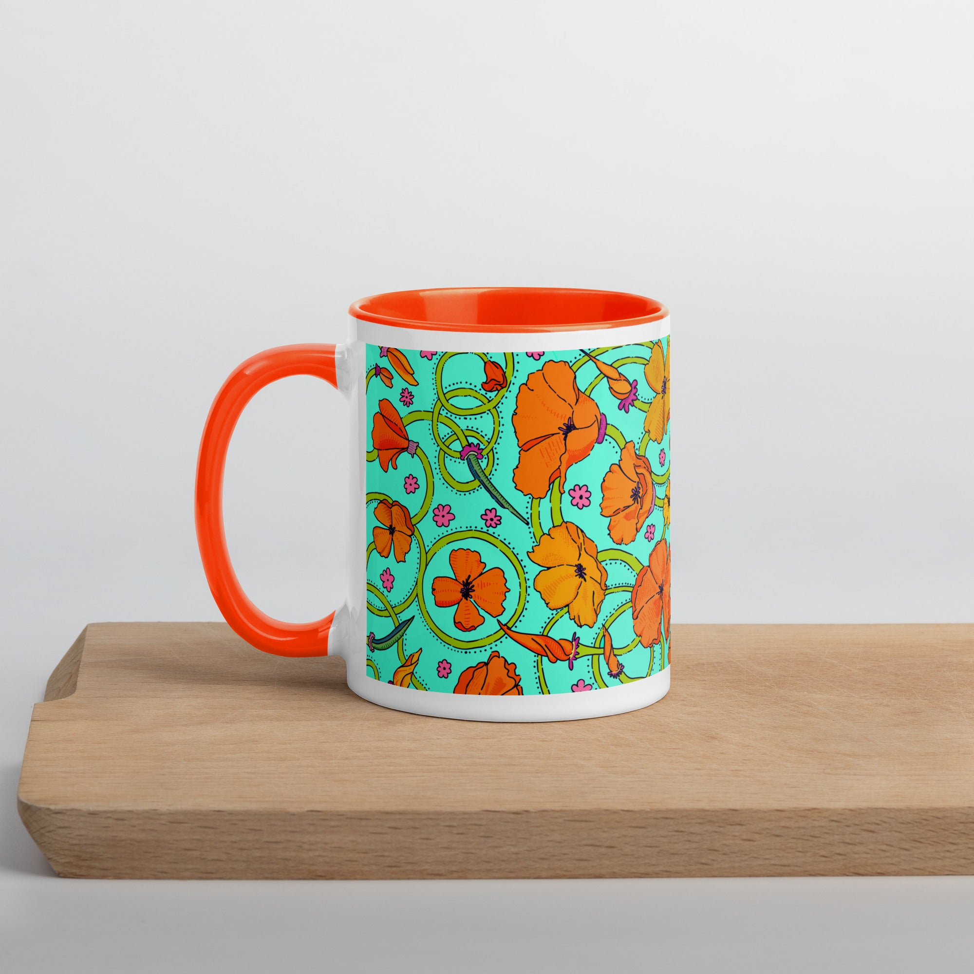 Get a little California in your cup. This California poppies mug features a bright, cheery design, color inside and on the handle of the mug, with many different colors to choose from. Made from sturdy white ceramic, this mug will become a durable and eye-catching staple in your collection.